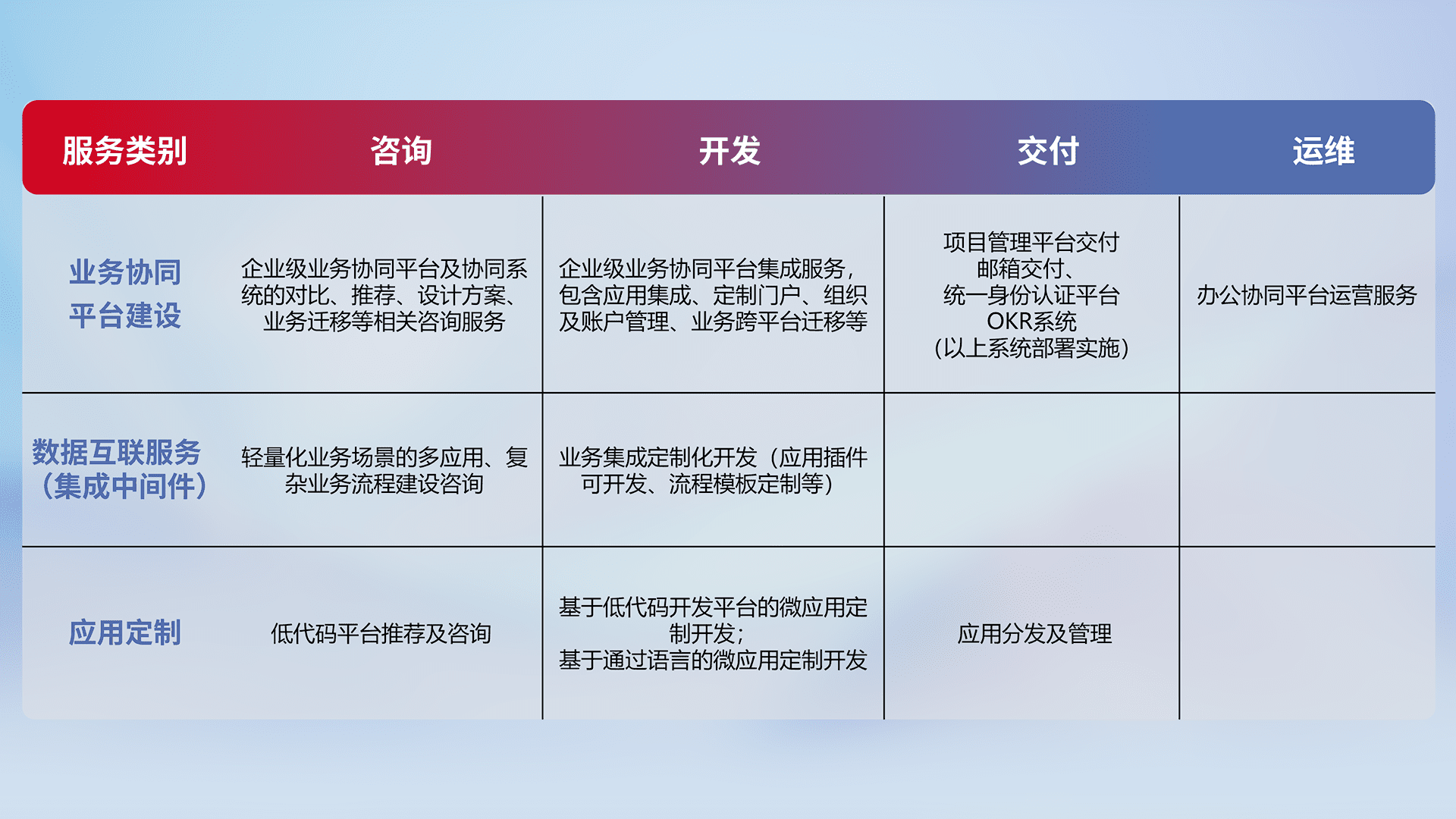 针对钉钉、、、、企微、、、、IDaas等平台级产品提供产品的规划、、方案、、、、交付、、、定制化开发等服务,,,实现如统一协同办公、、、、智能客户服务、、、、混合会议管理、、、、智能数据查询、、等业务场景,,,,实现数字化转型。。。。