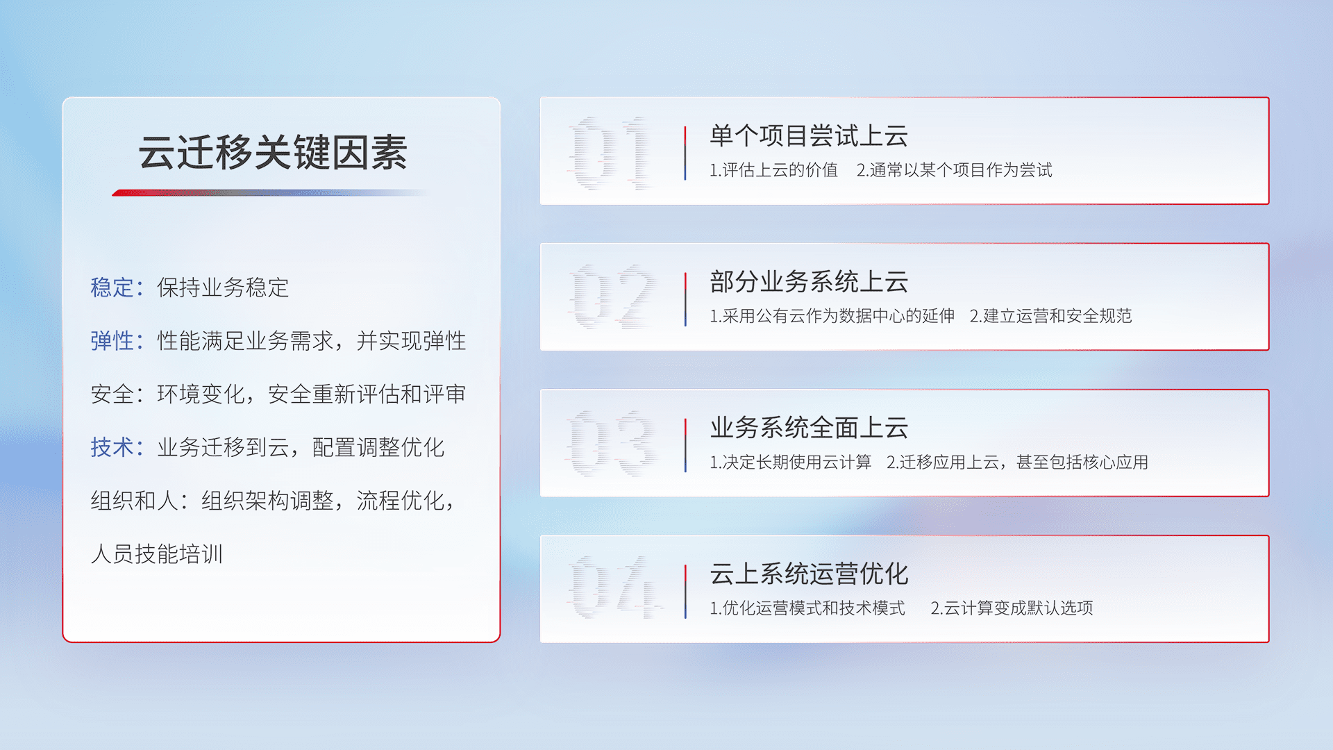 结合实际业务,,,从规划设计、、、云平台选型、、、云原生改造、、数据迁移、、集成交付,,,,迁移全过程为客户识别最佳上云路径,,,做好风险识别管理,,设计网络架构、、、身份权限、、安全审计合规、、、、操作审计、、、、日志审计、、、监控告警策略、、、多站点容灾设计等,,,对云上基础设施进行整体规划,,,提升IT治理水平,,,,以满足弹性、、、、高可用、、高性能的需求。。