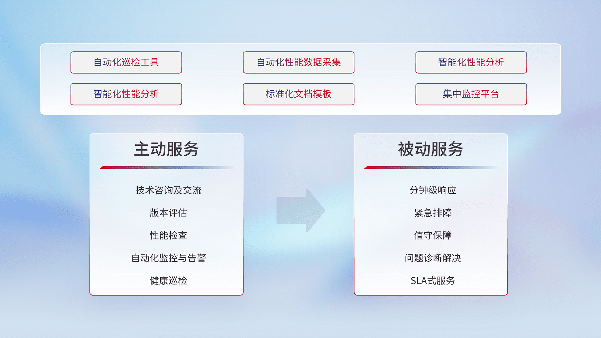 智能化工具和标准化文档,,,,保障服务质量,,,提供主动服务(包含技术咨询、、、、版本评估、、、性能检查、、、自动化监控与告警、、、、健康巡检)和被动服务包含(分钟级响应、、紧急排障、、、值守保障、、、问题诊断解决、、、SLA服务)。。。