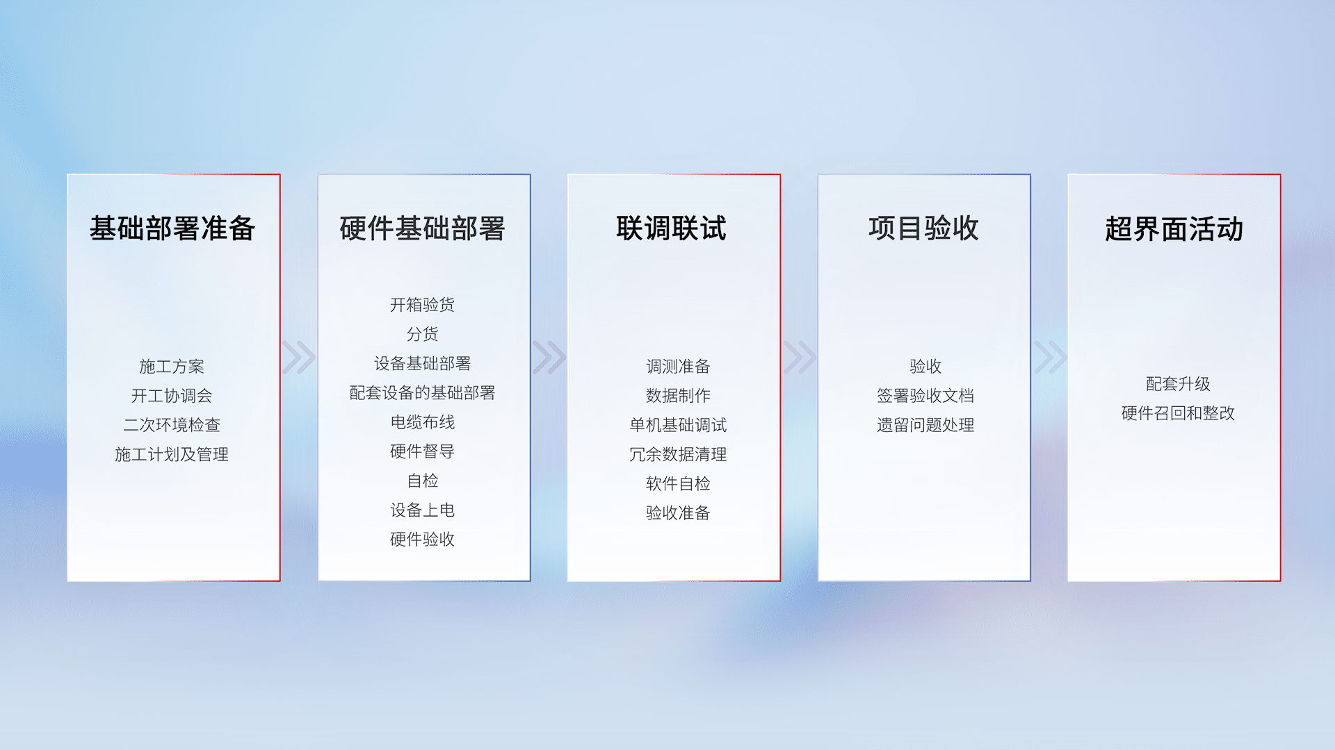 从基础部署准备、、、硬件基础部署、、、联调联试、、项目验收、、越界面活动的全过程可追溯,,,保证施工质量和进度。。。。