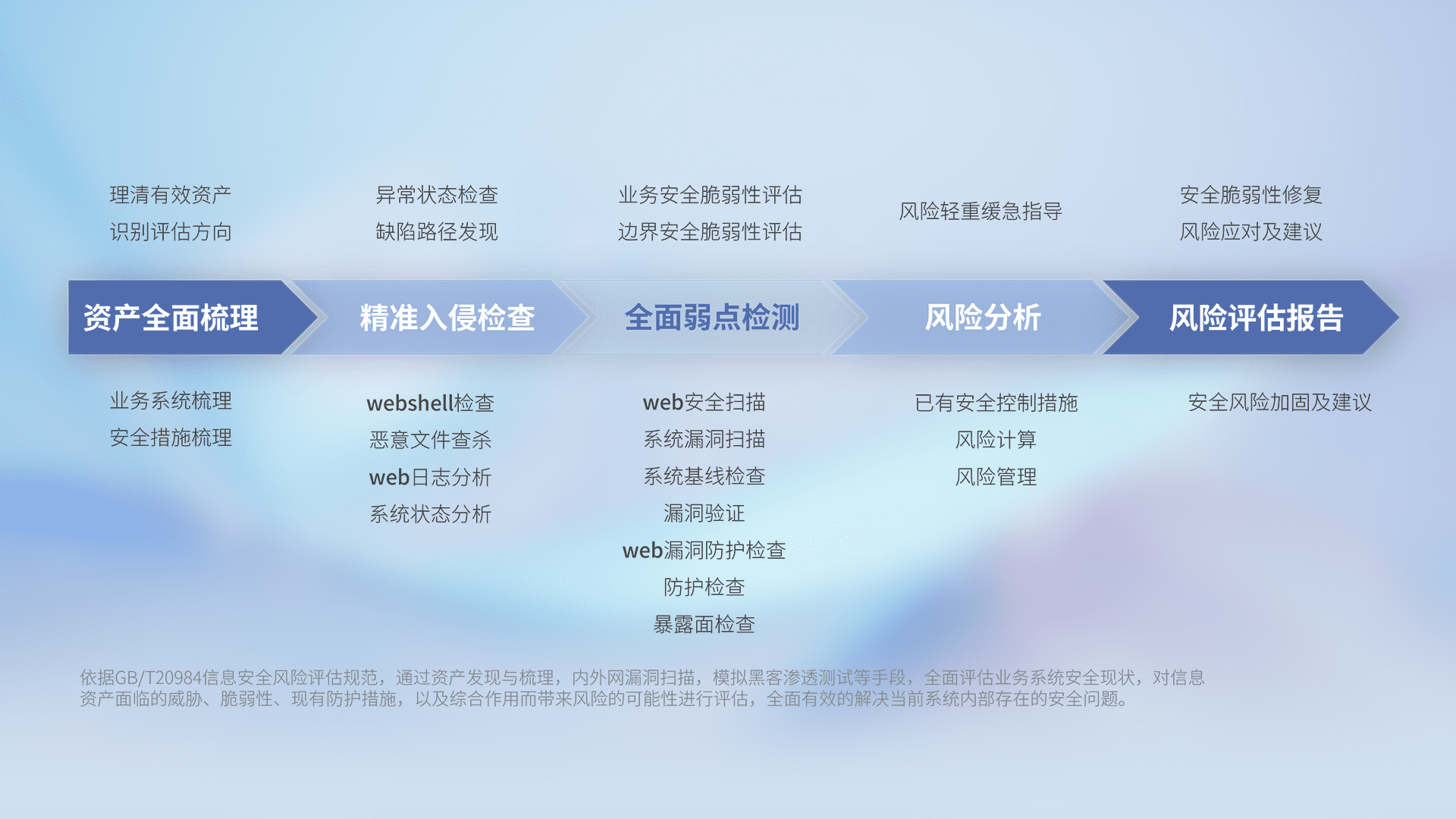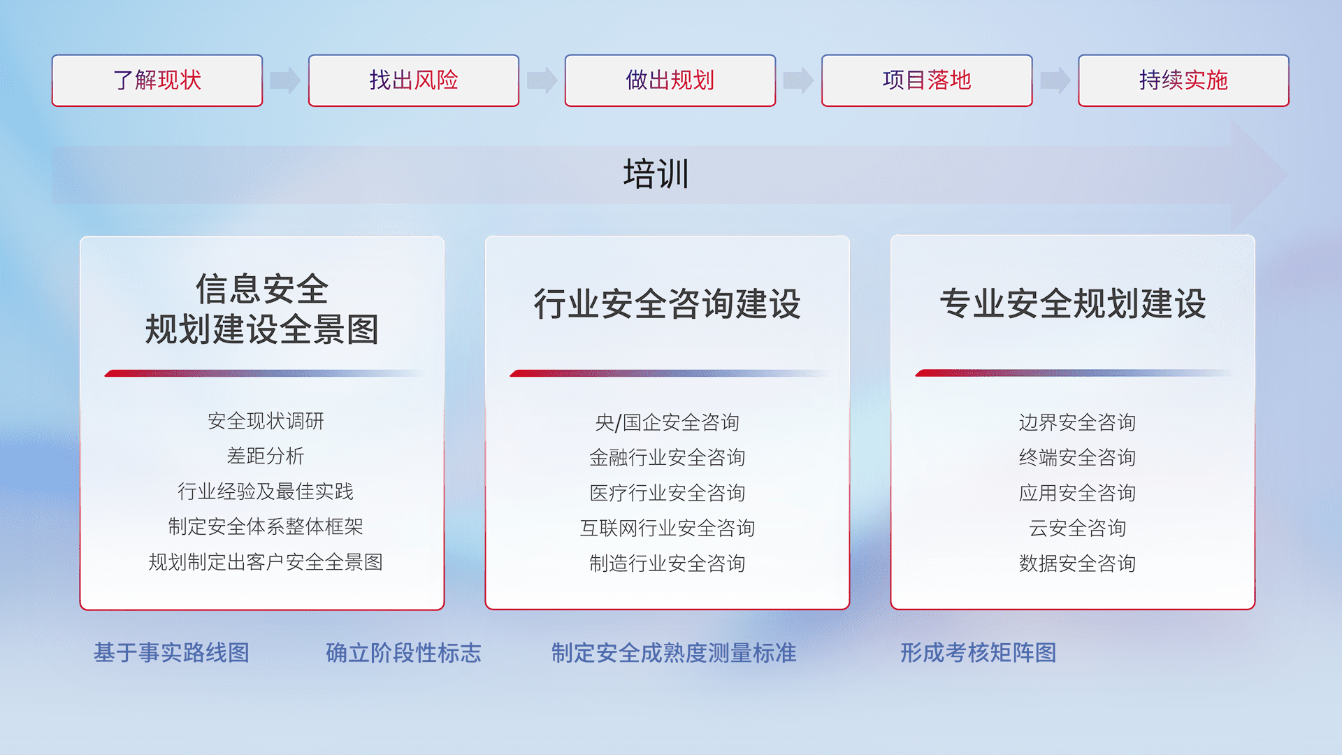针对客户行业特性,,,以专业的安全服务+多厂商联合解决方案提供专属的一站式安全管理服务,,,帮助客户全面感知网络空间威胁,,,基于识别、、检测、、分析、、防护、、、、监测、、、、响应的服务理论模型,,,从方案咨询、、、、集成交付、、、评估验证、、、、优化加固、、运维运营,,致力于为客户提供完整的闭环管理式安全服务。。以实战经验为客户打造高抵御风险的安全体系,,帮助客户发现威胁、、对抗威胁、、、处置威胁,,,,不断积累安全对抗能力,,,持续保障数字化安全。。